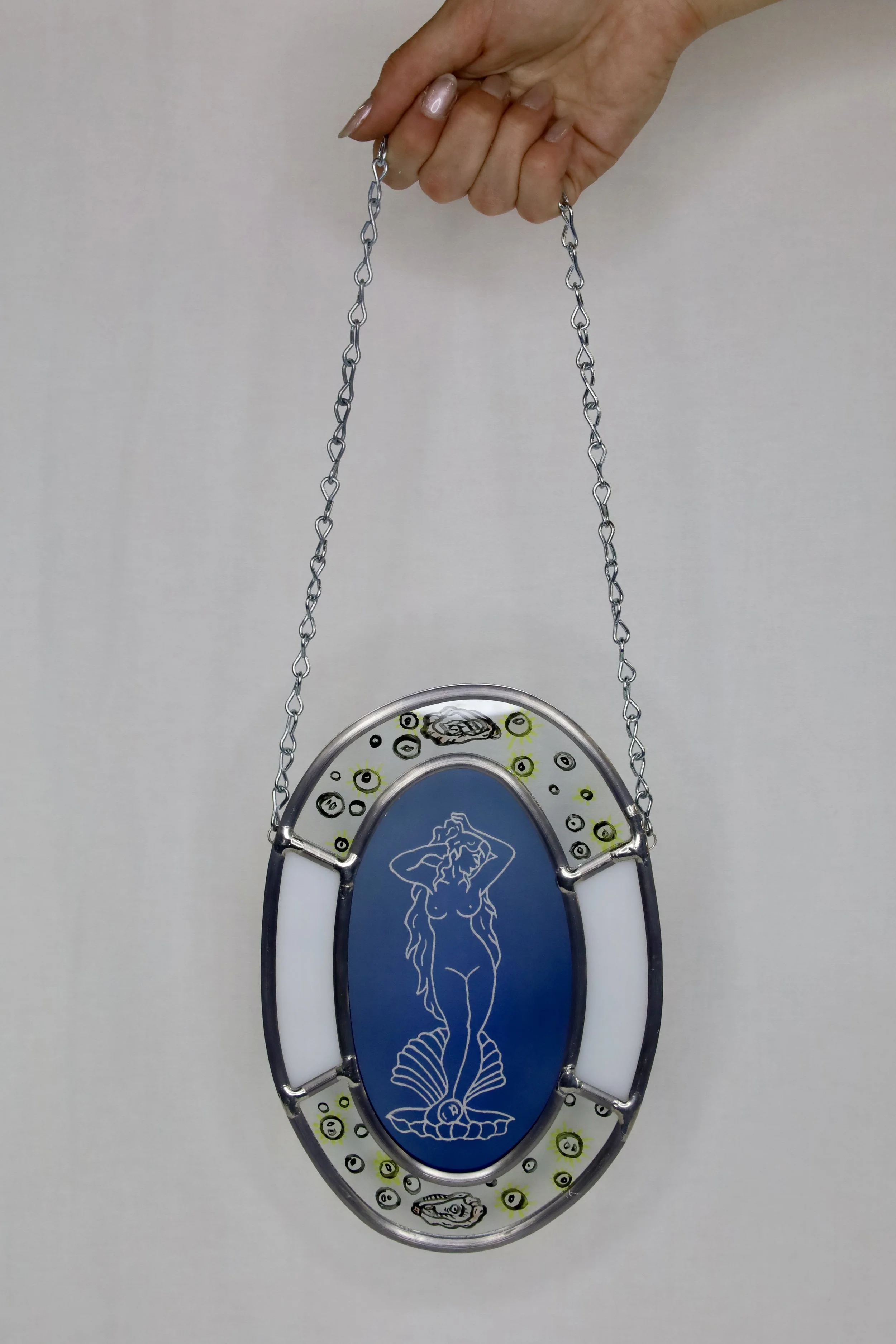 hand blown rondel, sheet glass from Fremont Glass, donated enamel painting, lead came. 2022.