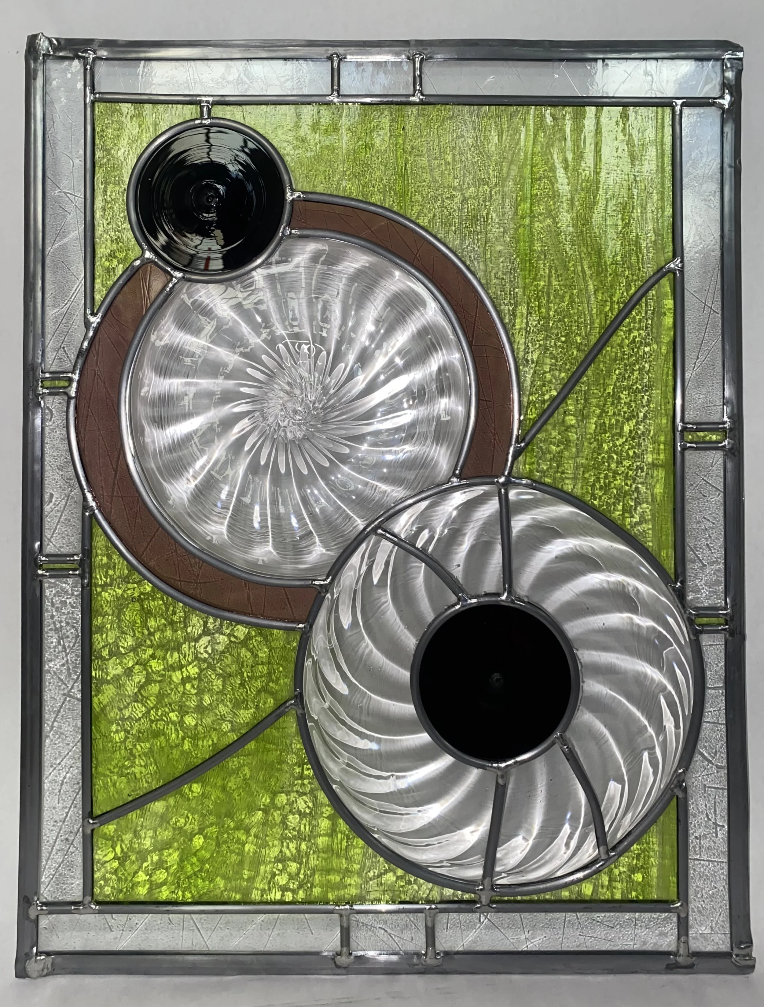 hand blown soft glass and borosilicate rondels. Fremont Glass sheet glass, sheet glass, lead came, solder. 2024.